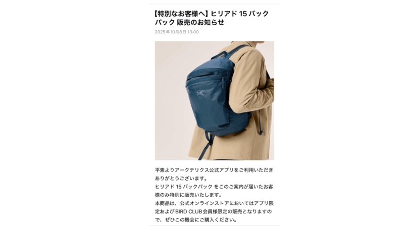 ①アークテリクスから特別販売の通知が届きます