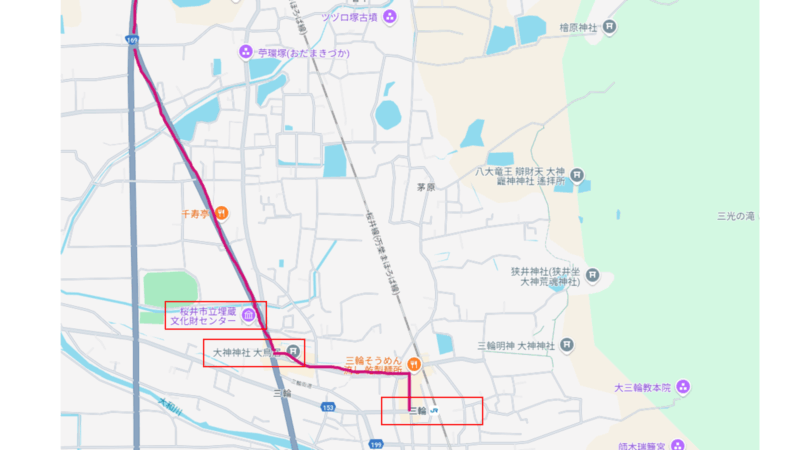 箸墓古墳周辺から桜井市立埋蔵文化財センターを見学してJR三輪駅までのコースです
