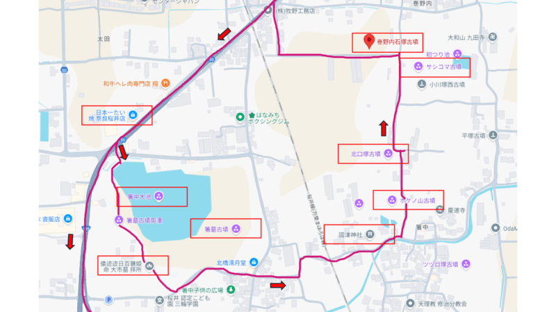 今回は箸墓古墳からホケノ山古墳に行ってグルっと回って箸墓古墳に戻るコースになりましたが、効率よく歩くなら最初に巻野内石塚古墳を見てホケノ山古墳、箸墓古墳と回り、最後に桜井市立埋蔵文化財センターを訪れるコースが良いかもしれません