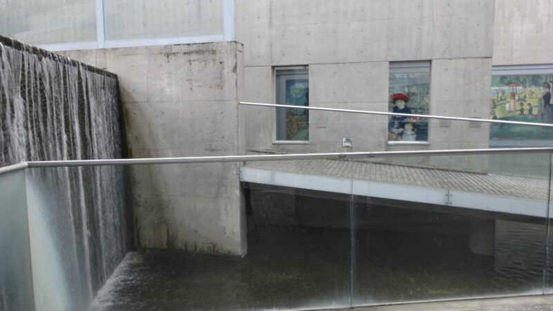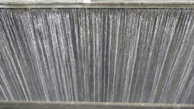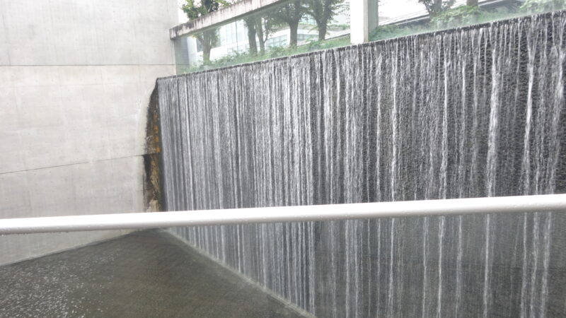滝から水が勢いよく流れる演出は自然と無機質のコンクリートの共生を狙っているのでしょうか