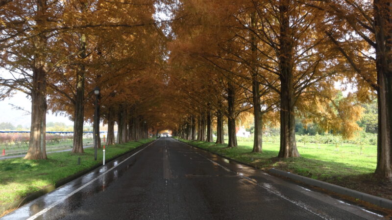 両側のメタセコイアの紅葉した葉が道を覆いつくすように続きます
