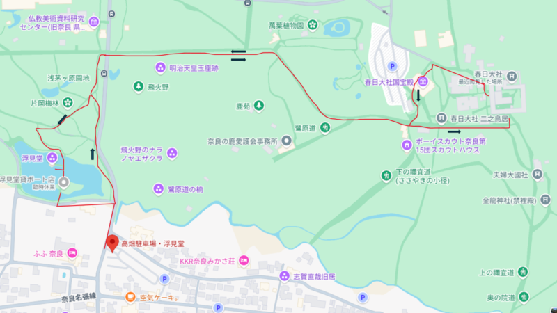 今回は県営高畑駐車場に車を停めて歩いて春日大社まで行くルートを紹介したいと思います
