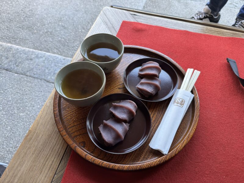 赤福餅2つとほうじ茶がセットになっていてやはり出来立てはおいしいですね