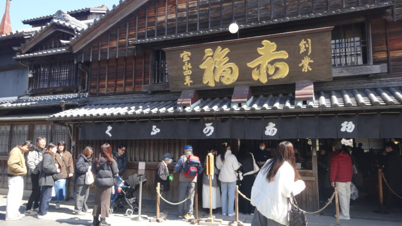 「赤福本店」の道を挟んだ反対側に有名な「おかげ横丁」の入り口があります